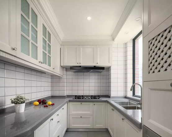 純白可能有些單調(diào),這個(gè)時(shí)候可以用局部亮點(diǎn)來點(diǎn)綴:餐具、臺面、電器、花卉都是搭配利器。后擋板也有無限創(chuàng)造性,大理石,花磚、馬賽克……你想得到的都可以用得上。