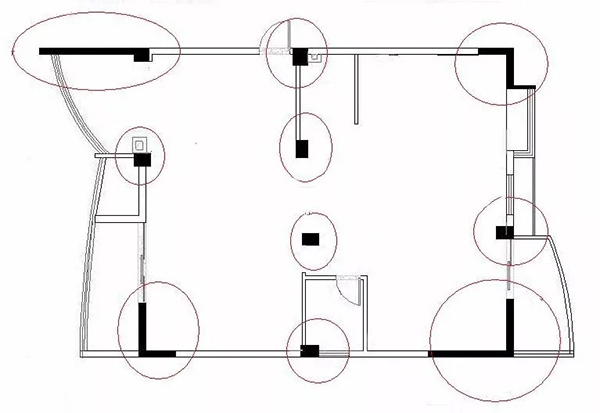 如果你有自己房屋的戶型圖,可以打開(kāi)看看,如圖所示,在工程圖上標(biāo)注為黑色的墻體就是承重墻,而標(biāo)注為白色部分的墻體為非承重墻,這類墻體可以進(jìn)行適量拆改。