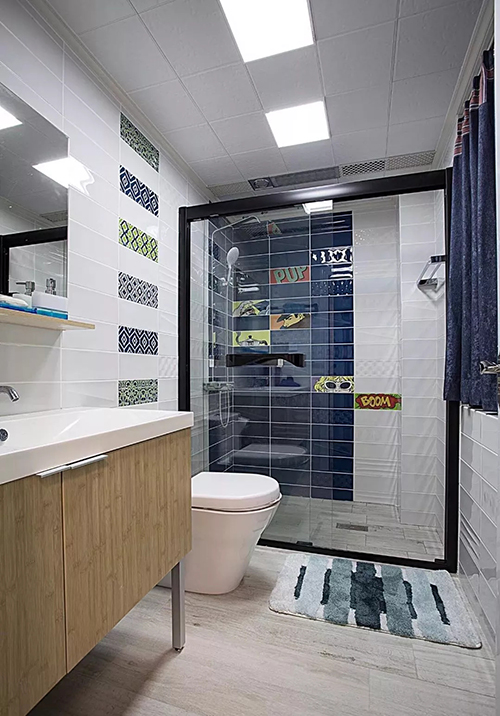 利用花磚給空間分區(qū),是效果最柔和也最能營造空間層次感的做法,一般使用于衛(wèi)浴間、廚房。