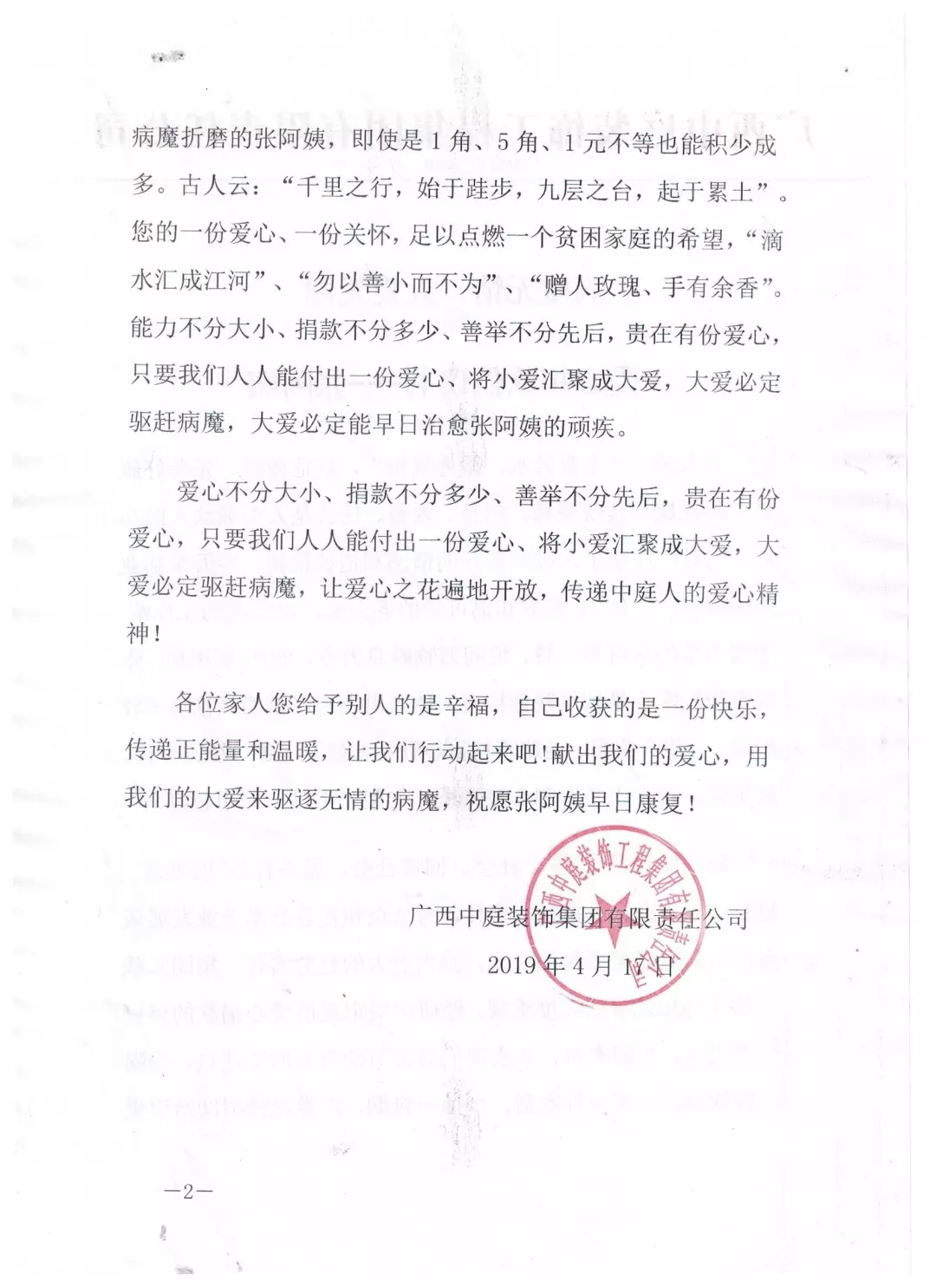 集團(tuán)總裁丁胡先生向全體員工號召,為張阿姨獻(xiàn)出一份愛心。捐款不分多少,貴在有份愛心,只要我們?nèi)巳硕寄芨冻鲆稽c愛、將小愛匯聚成大愛,大愛必定驅(qū)趕病魔,大愛定能早日治愈張阿姨的疾病。