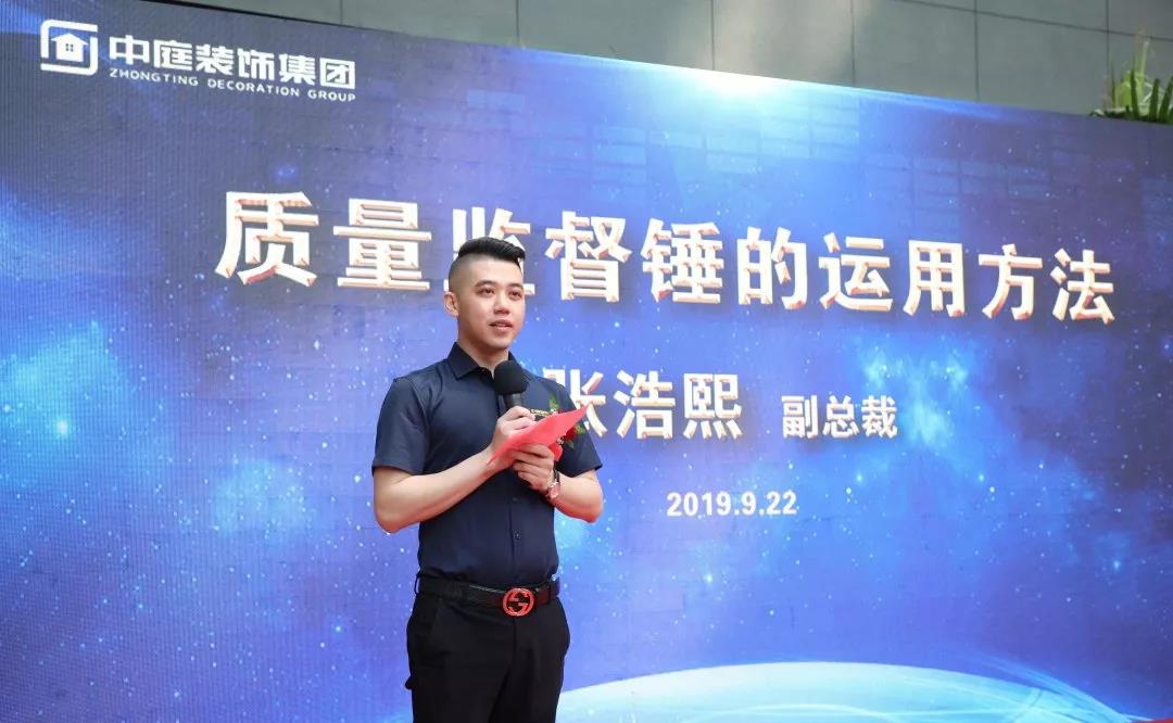 ▲集團副總裁張浩熙先生向業(yè)主代表授予質量監(jiān)督錘,并講解質量監(jiān)督錘的運用方法。