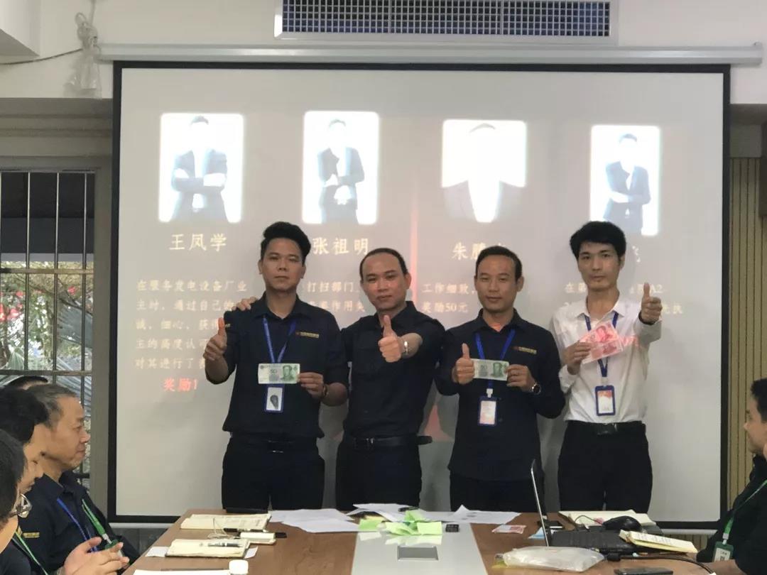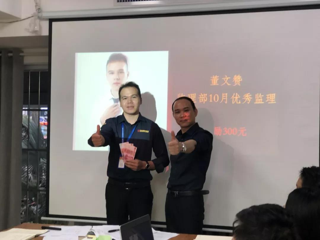 吳總(右一)為項目經(jīng)理殷傳高頒發(fā)月度獎金