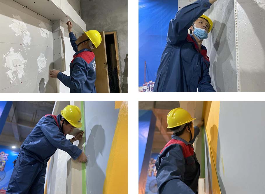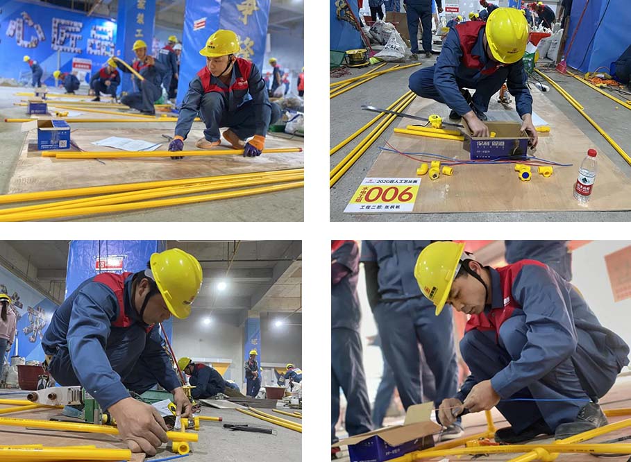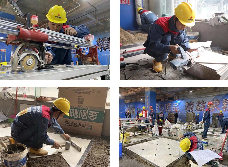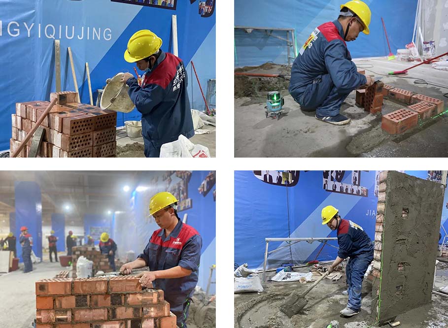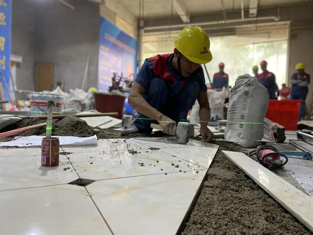 現(xiàn)場一共有土建組、水電組、瓦工組、膩子組四大工種賽區(qū),參賽選手在相對應的工位,根據(jù)圖紙要求進行比賽。