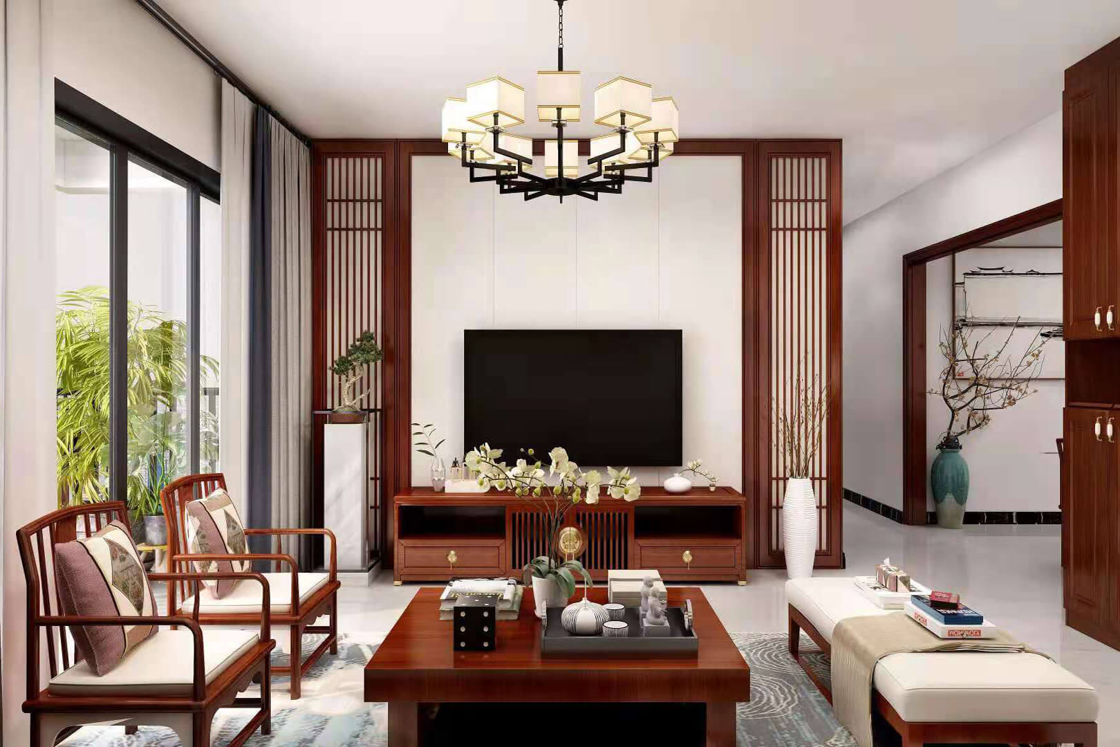 瀏覽量:552房子整體家具以紅木為主。客廳采用白色地磚和留墻面與家具搭配讓顏色看起來更為簡潔,不做裝飾的吊頂讓整體的空間看起來更寬大。房間采用紅木地板與房間家具色彩呼應,墻面留白用水墨畫裝飾讓房間裝飾更豐富,也讓色彩更多了層次感。